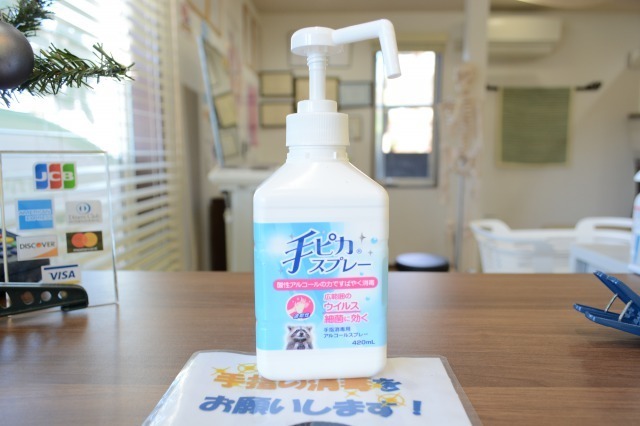 皆様に安心してご利用いただけるように、受付にはアルコール消毒を常備しベット・イス・ドアノブ・トイレなどは次亜塩素酸を用いてウイルス対策を施し衛生的にも清潔に保ち、定期的な換気もしています。